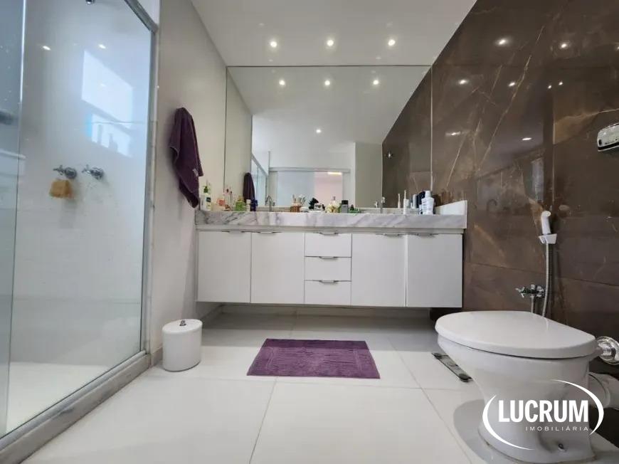 Banheiro da Suíte Master com piso em porcelanato, box blindex, bancada de mármore, lindos armários planejados
