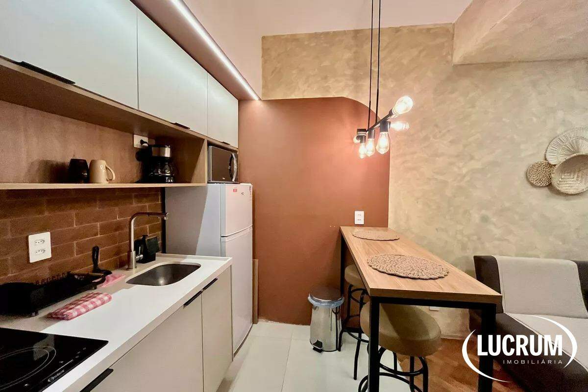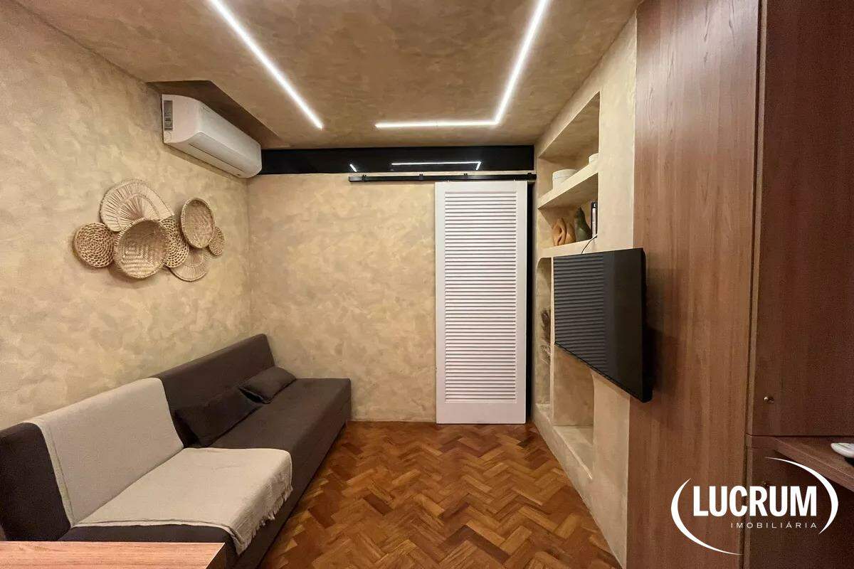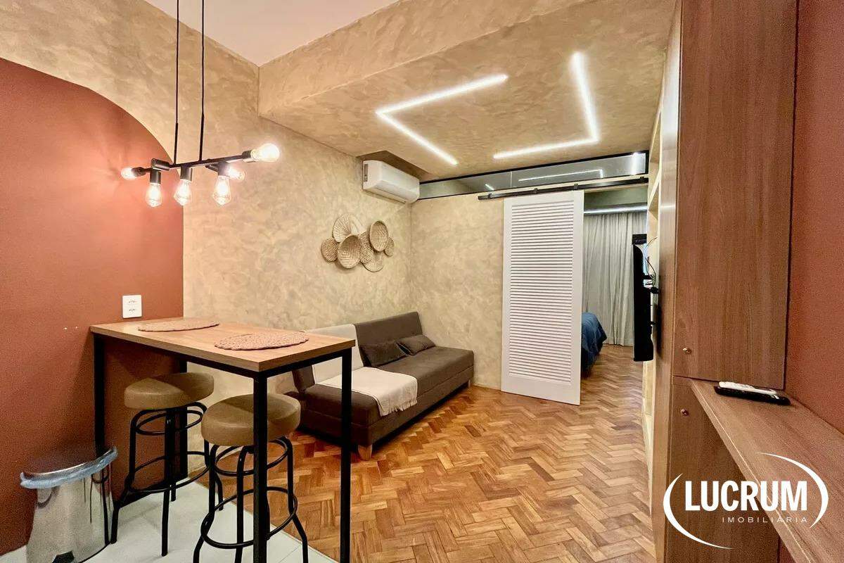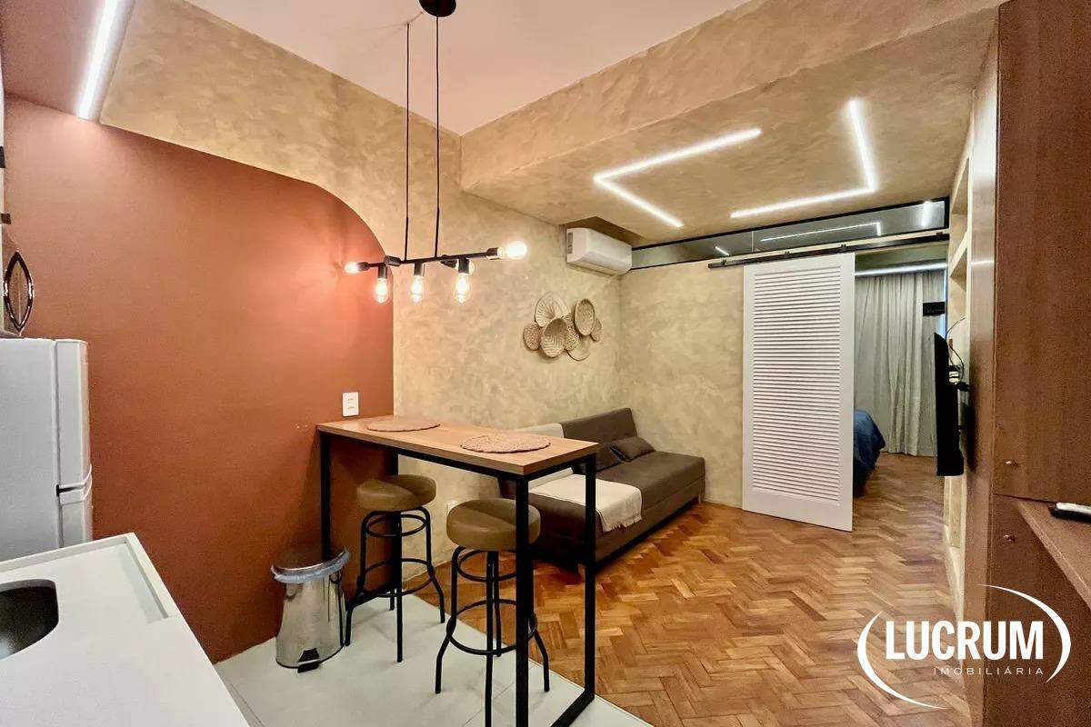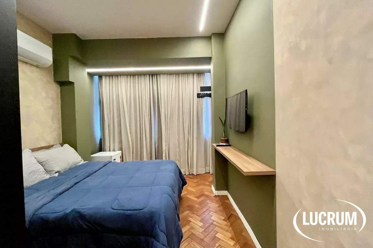 Pronto para locação de temporada, moradia ou locação de longo prazo. Finamente reformado e decorado. Quarto integrado com cozinha americana, ar-condicionado Split. Cozinha equipada com cooktop, microondas e geladeira. Amplo banheiro. Prédio com portaria 24 horas. Possibilidade de alugar vaga de garagem no próprio prédio.