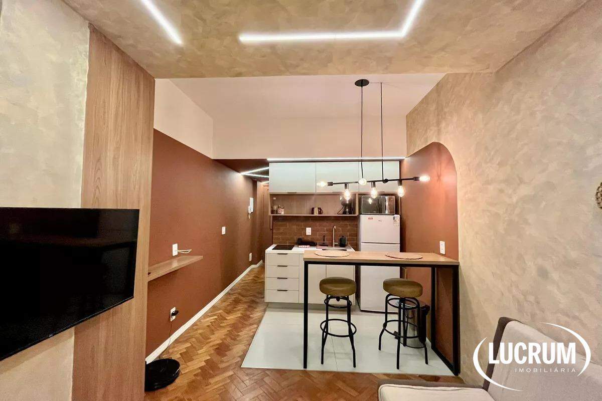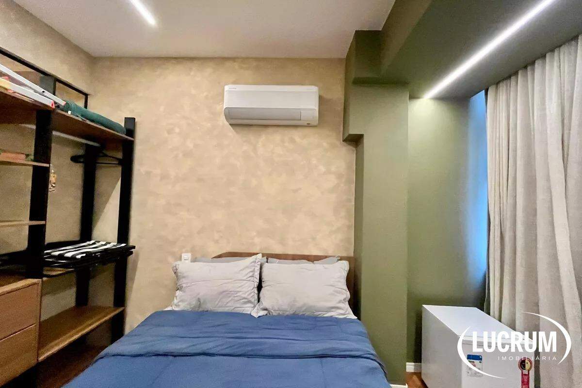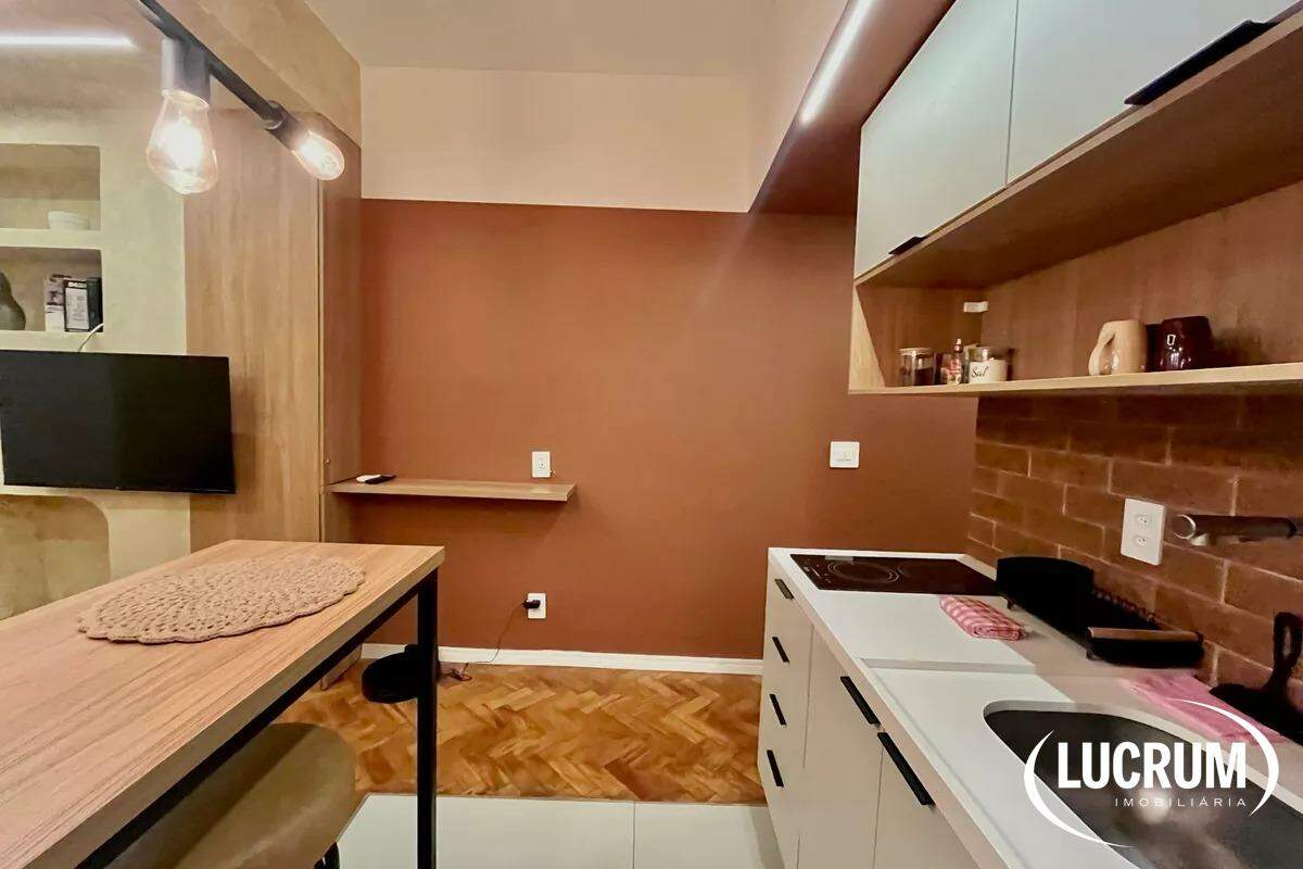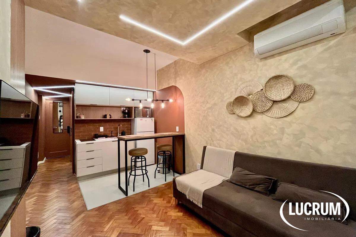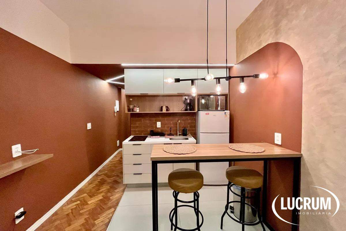 Pronto para locação de temporada, moradia ou locação de longo prazo. Finamente reformado e decorado. Quarto integrado com cozinha americana, ar-condicionado Split. Cozinha equipada com cooktop, microondas e geladeira. Amplo banheiro. Prédio com portaria 24 horas. Possibilidade de alugar vaga de garagem no próprio prédio.